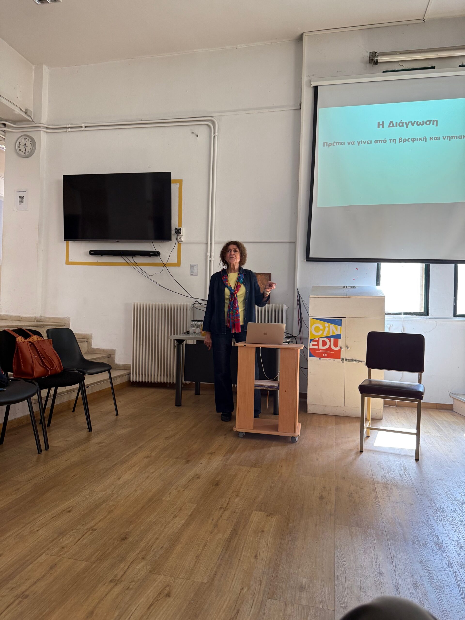 Στο πλαίσιο των ομιλιών που πραγματοποιούμε στα σχολεία, τον Οκτώβριο η Δρ. Ελάνη Λιβανίου μίλησε σε όλους τους εκπαιδευτικούς του Γυμνασίου Φιλοθέης για τις νευροαναπτυξιακές διαταραχές. Εξήγησε κάθε μία ξεχωριστά, σκιαγραφώντας την εικόνα του μαθητή μέσα στην τάξη και παρουσιάζοντας πρακτικούς τρόπους με τους οποίους ο εκπαιδευτικός μπορεί να τον υποστηρίξει.